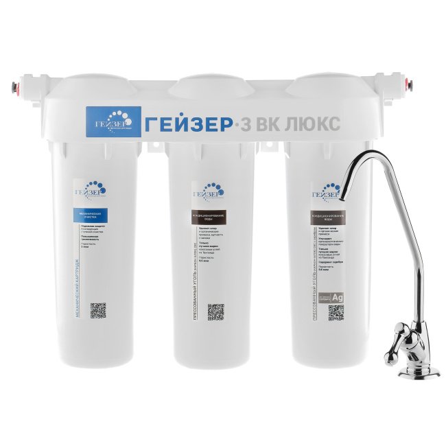 Экономичный трехступенчатый фильтр Гейзер-3 для мягкой воды представляет собой небольшое устройство со стандартной схемой фильтрации воды с увеличенным ресурсом по удалению тяжелых металлов, железа, хлора и органических примесей. Имеет достаточно небольшой, компактный размер. Поставляется в комплекте с краном №3.