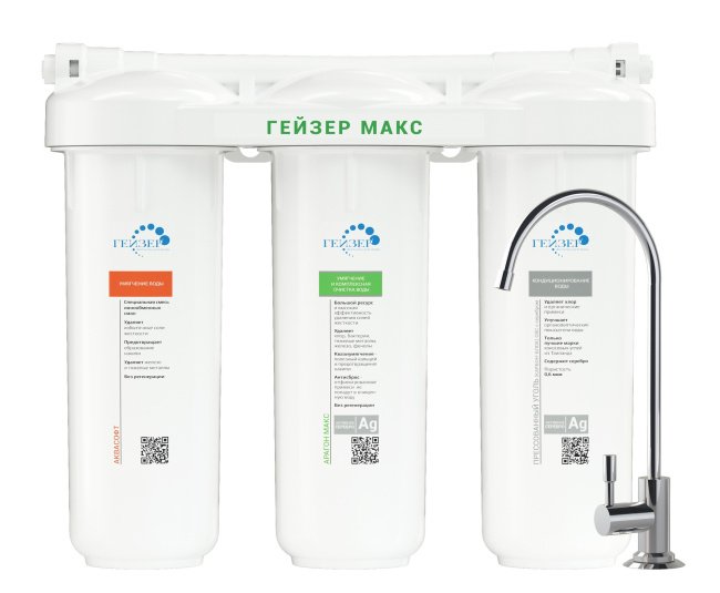 В фильтрах серии Гейзер МАКС реализованы все известные методы очистки воды: механическая фильтрация, ионный обмен, сорбция, обезжелезивание и обеззараживание.