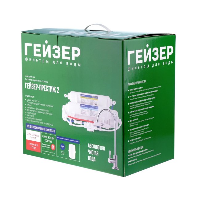 Технология обратного осмоса в фильтре Гейзер Престиж 2, заключается в фильтрации воды через полупроницаемую мембрану. Размеры пор мембраны настолько малы, что пропускают только молекулы воды. Размер молекул большинства примесей, а также бактерий и вирусов значительно больше молекул воды, поэтому они не проходят через мембрану. Специально разработанный блок предочистки позволяет очищать воду с высоким содержанием солей жесткости и растворенного железа.