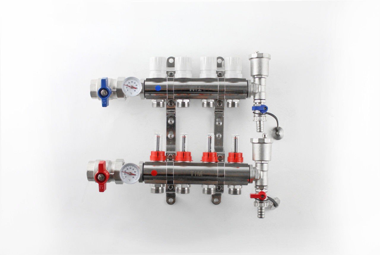 На подающем коллекторе расположены расходомеры с возможностью фиксировать положение, а на обратном коллекторе - термостатические вентили, с декоративной белой накладкой, сняв которую можно подключить сервомотор и любую другую автоматику управления.