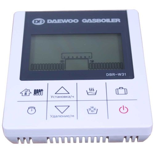 Выносной терморегулятор (пульт дистанционного управления), технический паспорт уже входит в комплектацию. К котлу Daewoo Gasboiler (ДЭУ Газбойлер) подойдут все виды генераторов, ему не нужны мощные стабилизаторы, вам не придется устанавливать УЗО и строить дымоход — можно купить специальный коаксиальный дымоход.