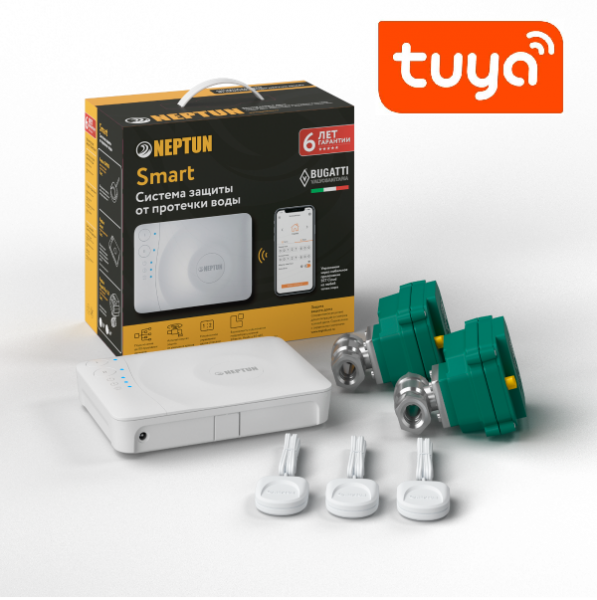 Система Neptun Bugatti Smart 3/4 Tuya предназначена для защиты от протечек в системах водоснабжения и отопления. Она состоит из контроллера, датчиков протечки, электроприводов и модуля управления. Система может работать как автономно, так и в составе умного дома. Она автоматически перекрывает краны при обнаружении протечки и отправляет уведомление на смартфон.
