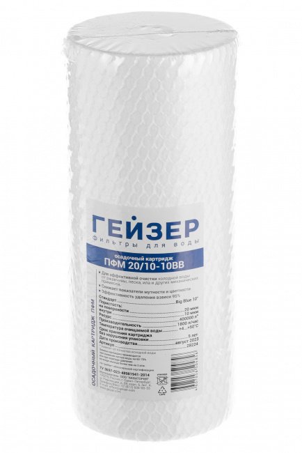 Картридж ПФМ 5/1 10BB предназначен для очистки воды от нерастворимых примесей. В отличие от PP обладают градиентной пористостью: диаметр поры уменьшается при движении воды внутрь картриджа, позволяя работать всему объему фильтрующего материала. У картриджей есть модификации для горячей воды. Не восстанавливаются и не регенерируется.